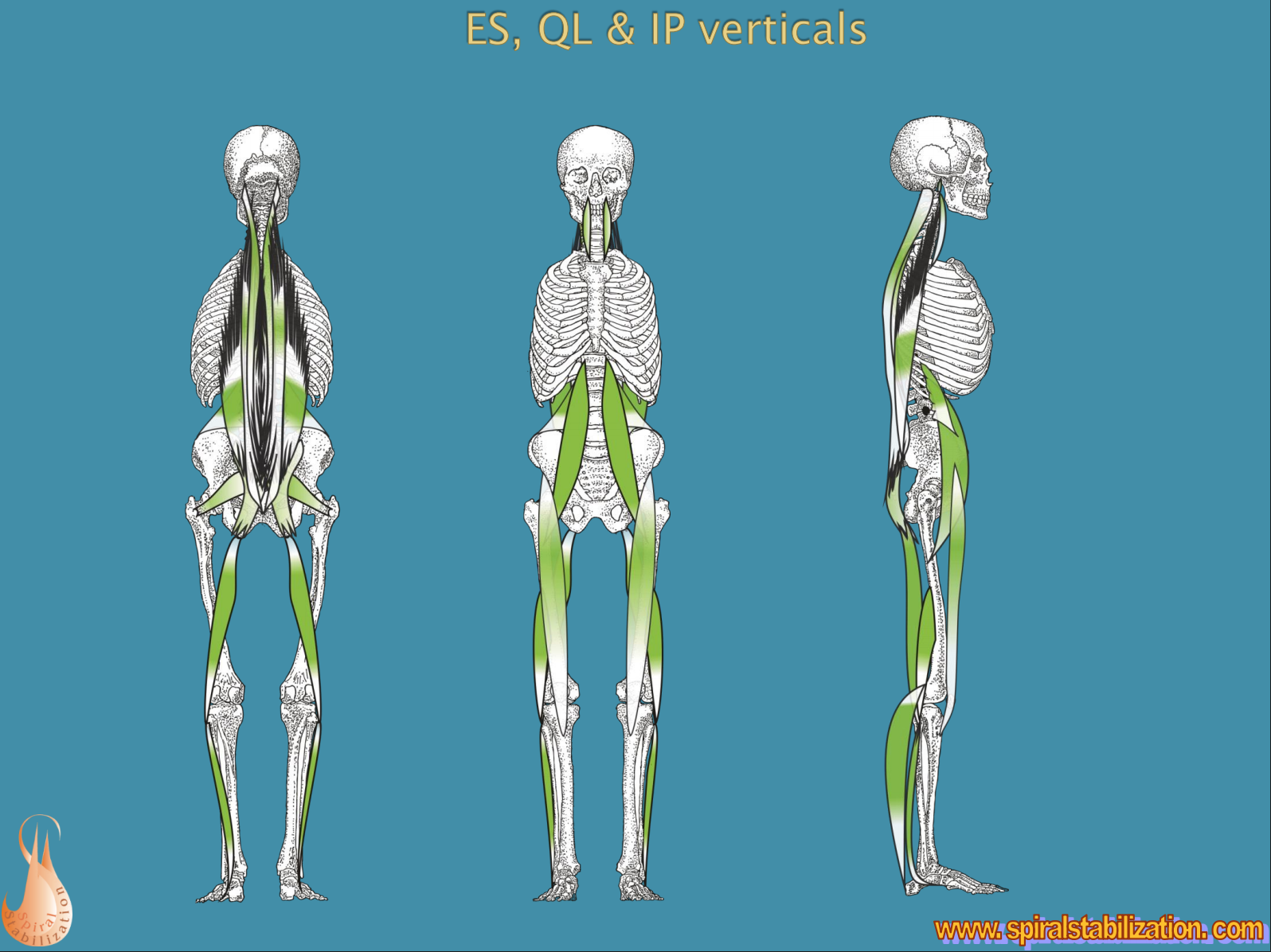 Spirális izomláncok - funkciójuk a test stabilizálása mozgás közben (séta, futás, sport). Az e láncokon belüli izmok gyakran gyengék és erősítésre szorulnak.